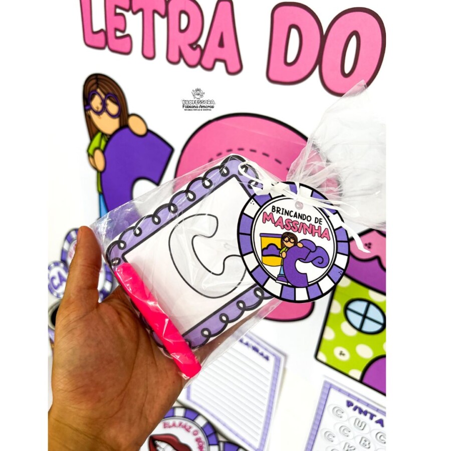 Lembrancinha “Massinha em ação” com fichas e lapela para praticar o formato da letra em casa.